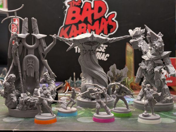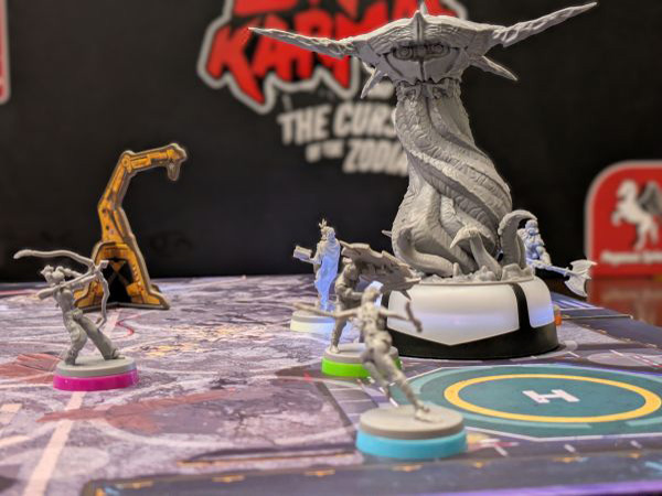 „Bad Karmas” kommt in einer ziemlich großen Box. Umso überraschter war ich, als ich sah, dass diese ziemlich leer ist. Es gibt vier große, um nicht zu sagen überdimensionale Bossmonster, denn Miniaturen kann man dazu eigentlich nicht mehr sagen. Dazu gesellen sich fünf kleine Heldenminis, ein intelligenter Würfel, mehrere Spielpläne, ein paar Stanzbögen mit verschiedenen Objekten und das war es. Trotz der großen Plastikungetüme ist noch viel Luft in der Box. Immerhin kann das Teburu-Board auch darin untergebracht werden und wahrscheinlich wurde noch Platz für die Erweiterungen gelassen, denn eigentlich sollen es ja zwölf Bosse sein, die es zu besiegen gilt. In der Kickstarterkampagne und in der App sind bereits weitere Bosse verfügbar, und inzwischen hat Pegasus auch mehrere Erweiterungen angekündigt.