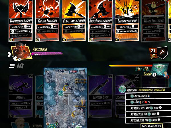 Hinzu kommt, dass gerade der erste Boss recht schwer zu lesen ist. Anstatt die Anfänger einer Kampagne mitzunehmen und die verschiedenen Aspekte nach und nach einzuführen, wird man fast komplett ins kalte Wasser geworfen. Immerhin gibt es ein Tutorial, in dem die Grundmechanismen und der Rundenablauf erklärt werden, aber das war es dann auch schon. Natürlich kann man das auch den Spielenden vorwerfen. Man kann vieles anklicken oder sich per Tooltipp erklären lassen, aber das muss man dann auch machen. Zudem hält es die ganze Gruppe auf, wenn man etwas verstehen möchte, was am Hauptbildschirm gerade passiert ist.
