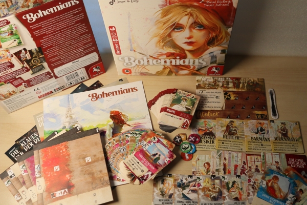 „Bohemians“ ist ein Deck-Building-Kartenspiel von Jasper de Lange mit Illustrationen von Hanna Kuik, Roman Kucharski und Tomasz Jedruszek für ein bis vier Spielende. Als Inhalt gibt es 4 Tagesplan-Tableaus, 1 Atelier-Tableau, 90 Gewohnheiten-Karten, 13 Erfolg-Karten, 21 Musenkarten, 29 Leidenskarten, 12 Solomodus-Karten, 3 Zeitgeist-Szenarien, 4 Arbeitsplättchen, 4 Ateliermarker, 4 Erinnerungsmarker, 1 Startspielermarker und 1 Anleitung.