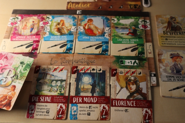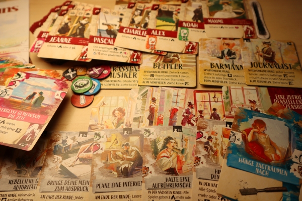 Wie ihr hier vielleicht gemerkt hat, versucht das Spiel alles, um einen in die Zeit und die Straßen von Paris abtauchen zu lassen. Mit Karten wie „Entdecke dich selbst neu“, „Male ohne Unterbrechung“, „Schlendere ziellos durch die Straßen“ oder „Gehe ins Bordell“, lassen sich kleine Geschichten am Spieletisch erzählen. Wer möchte, kann daher jeden Tag den anderen von seinen Erlebnissen berichten oder diese sogar noch ausschmücken (Siegpunkte gibt es für solche ausschmückenden Erzählungen jedoch keine).