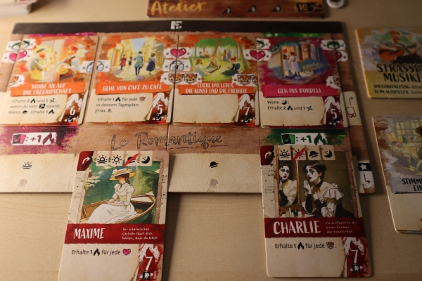 Spielerisch läuft es folgendermaßen ab: Jede Person startet mit demselben Startdeck an Karten, welche sich allerdings in der Bildsprache und den Kartennamen unterscheiden. Diese spielt ihr auf ein vor euch liegendes Tableau aus, um den Tag zu gestalten. Die Tableaus tragen jeweils unterschiedlich Namen, um auch damit die Atmosphäre realistisch werden zu lassen. Seid ihr eher der Typ „Le Romantique“, L’Excentrigue“, „Le Visionnaire“; oder „Le Vagabond“?