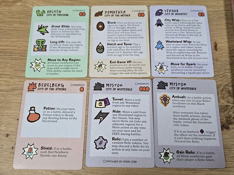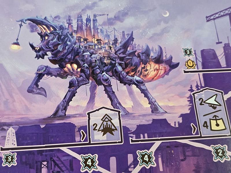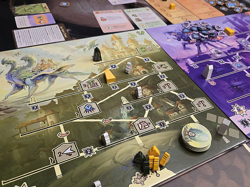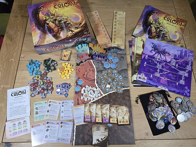 Diese Gesamtgemengelage kenne ich von anderen Spielen nicht. Wir haben hier also nicht das hundertste Worker-Placement-Spiel vor uns, sondern ein gleich mehrere Spielpläne verknüpfendes Biest. Allein der hohe Neuheitsfaktor von „Children of the Colossi“ ist also besonders hervorzuheben. Genauso wie die Zusammenstellung der Kolosse. Wir haben fünf davon in der Spielbox. Bedelburg, Strovo oder Mystor heißen diese. Und diese bieten in wechselnder Zusammenstellung Abwechslung für Folgepartien. Die Anleitung hat dafür Szenarien parat, für die das Spielgefühl jeweils kurz beschrieben wird. Da gibt es zum Beispiel das „Age of Travellers“, für das die Kolosse mit den meistens Bewegungsoptionen ins Spiel kommen. Oder im „Age of Conflict“ sind beide Kolosse im Spiel, die auf Kampf fokussiert sind. Diese geführte Einleitung in die Eigenschaften der Colossi hilft beim Kennenlernen des Spiels und seiner möglichen Dynamiken. Irgendwann hat man ein gutes Gespür für eigene Koloss-Zusammenstellungen. Und wahrscheinlich hofft der „Children of the Colossi“-Liebhaber dann auch auf Erweiterungen. Diese wird es in Form neuer Colossi geben, wenn das Spiel ein hinreichender Erfolg wird.
