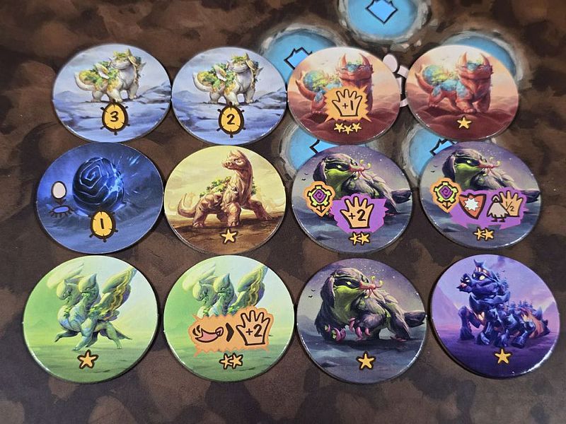 Am Ende des Zuges bewegt man den vorher benutzten Koloss ein Feld weiter. Dort legt er dann (wahrscheinlich vor lauter Freude) ein Ei. Dieses ziehen wir aus dem Sack, also dem beigelegten Stoffsack, und legen es auf eine der Brutstätten. An dieser Stelle verkneife ich mir jeglichen Sack-Ei-Witz. Ist die letzte Brutstätte voll, schlüpfen die kleinen Koloss-Racker. Die nun aufgedeckten Eier, also die Newborn, können durch unsere Envoys gezähmt werden. Wer den meisten Einfluss in dem Landstrich durch seine Worker generiert hat, kriegt das schönste Baby. Dabei kann Schönheit subjektiv sein: Siegpunkte oder Fähigkeiten? Dann sind alle anderen Mitspieler dran. Und grundsätzlich gilt: kein (freier) Envoy, kein Baby. Das übrig gebliebene Bonus-Baby (oder später die Bonus-Siegpunkte) erhält dann der einflussreichste Koloss-Flüsterer.