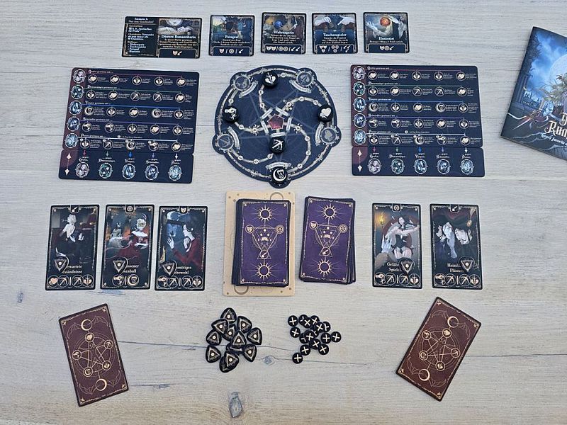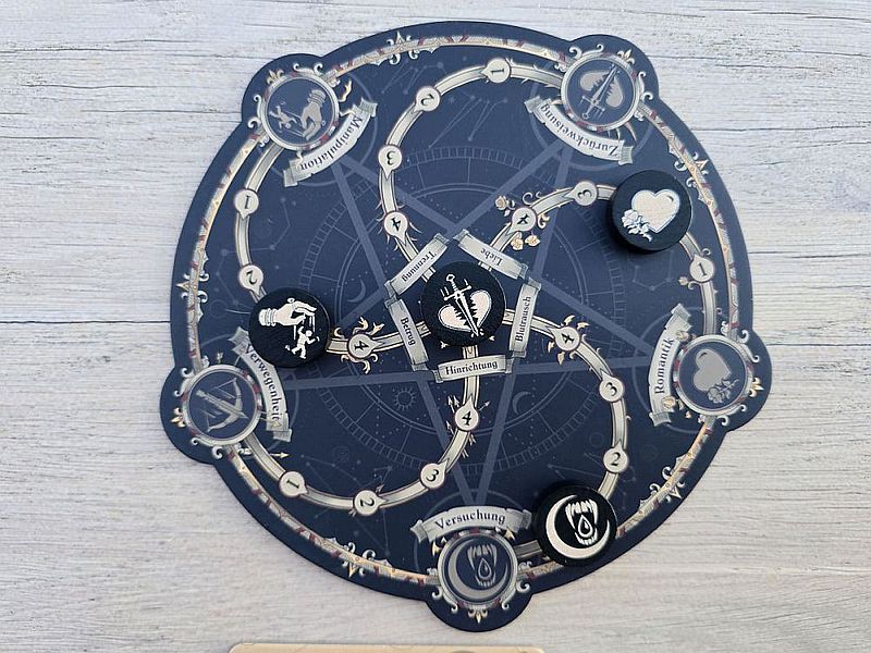 Szenario 2 erhöht die Komplexität merklich durch die vierte Rolle und die fünfte Leiste. Das Spiel ist das Fortgeschrittenen-Spiel. Doch Achtung! Selbst erfahrene Expertenspieler waren mit dem Direkteinstieg in Szenario zwei überfordert. Dieser Spielmodus hat uns ebenso einige Partien beschäftigt, bis wir den Kopf darum gewickelt bekommen haben. Glücklicherweise gibt es dann die Szenarien 3 bis 11, die allesamt den endausgebauten Profimodus mit fünf Rollen bieten. Witzig: Der nun dazugekommene Poet möchte einen tragischen Ausgang, aber auf die passende Art: ein Vampirbiss, ein Armbrustbolzen vom Dämonenjäger oder betrogen vom Schwindler. Den finalen Ausgang muss allerdings das Gegenüber bewirken. Sonst wäre es nicht tragisch, sondern lächerlich. Und wir wollen ja kein lächerlicher Poet sein …