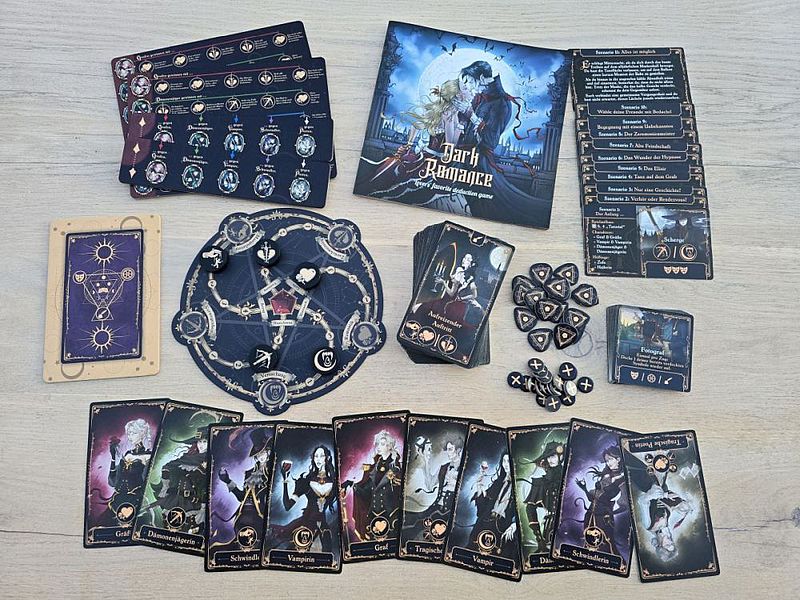 Dabei platziert sich „Dark Romance“ als „Lovers’ favourite deduction game“ thematisch sowie in der Aufmachung besonders. Erwachsene (und sehr geschmackvolle) Illustrationen mit teilweise leicht auszüglichen beziehungsweise anzüglichen Motiven erklären die Altersempfehlung ab 16 Jahren. Beim gemeinsamen Musizieren wird etwas Bein gezeigt, beim (Nackt-)Bad im Mondlicht auch ein gutes Stück mehr. Das Setting ist jedenfalls knisternd dargeboten, sodass die spielerische Verführung starten kann. Das Spielmaterial ist jedenfalls bereits in der vorliegenden Retailversion sehr ordentlich. Gerade die großen Karten wissen zu gefallen.