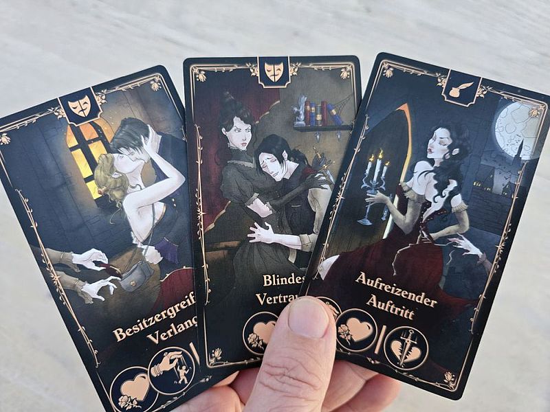 Zu Beginn der Partie bekomme ich heimlich eine Rolle per Karte zugewiesen. In meiner Rolle präferiere ich einen Ausgang für unsere Romanze, ganz in Abhängigkeit der Rolle meines Gegenübers, die ich aber nicht kenne. Der Vampir möchte, dass der Graf der Versuchung erliegt, der Dämonenjäger möchte den Vampir ganz verwegen hinrichten und der Poet möchte Tragik – aber bitteschön auf die passende Art.
