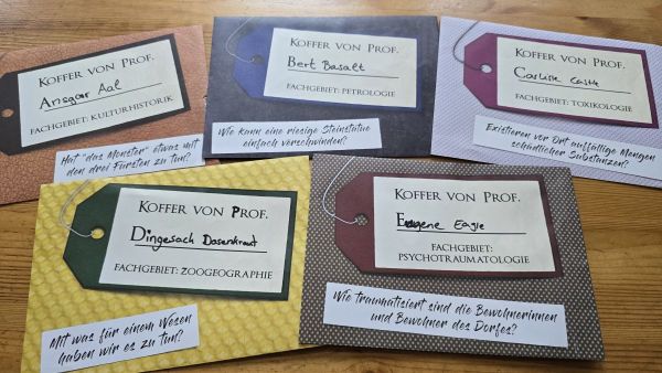 Das beigelegte Begrüßungsschreiben führt uns in das Spiel ein. Als guter Gastgeber hat man das Schreiben schon einmal vor dem Spieleabend durchgearbeitet, um die Spielegäste direkt stimmungsvoll und kompetent abholen zu können. Jeder der fünf Rollen ist ein Umschlag a.k.a. Koffer mit dem „Spezialwissen“ des jeweiligen Professors zugeordnet. Hier kann sich jeder Spieler bei der Lösung der Rätsel einbringen. Die Namensschilder komplettieren die Komponentenliste. Die kann man sich auf sein Oberteil kleben, damit man fortan auch korrekt angesprochen wird. Natürlich gibt es davon gleich mehrere, damit die Schilder immer schön kleben, wenn man das Spieleerlebnis auf mehrere Termine verteilt.