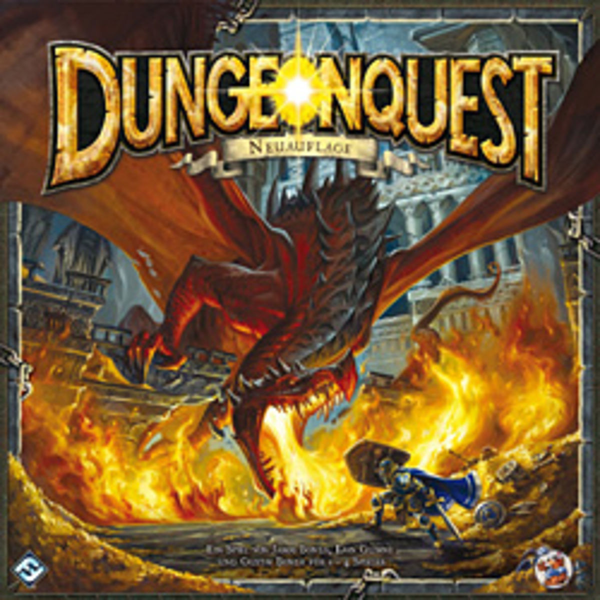 In „DungeonQuest“ übernehmen 1 bis 4 Spieler je einen Helden, um mit diesem dann einen klassischen Dungeon-Crawl zu bestreiten. Von einem Eingangsturm in den vier Ecken des schachbrettartigen Spielbretts ausgehend, bewegt man sich Zug um Zug durch ein modulares und mithilfe von verdeckt gezogenen Raumplättchen gebildetes Verlies, in der Hoffnung, bei Begegnungen und Suchaktionen möglichst viel Beute zu machen, ohne dabei von Fallen und Monstern umgebracht zu werden. Nahe liegendes Ziel jedes Helden ist natürlich der Drachenhort in der Mitte des Spielbretts, denn dort warten sagenhafte Schätze, die einem den Spielsieg sichern können. Allerdings muss man stets auch noch seinen Weg aus dem Dungeon hinaus finden – und die Zeit läuft auf einer Sonnenleiste am Spielfeldrand gnadenlos mit, denn nur bei Tag kann man das Dungeon halbwegs gefahrlos (hüstel) durchstreifen.
