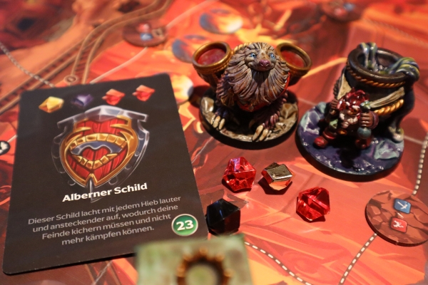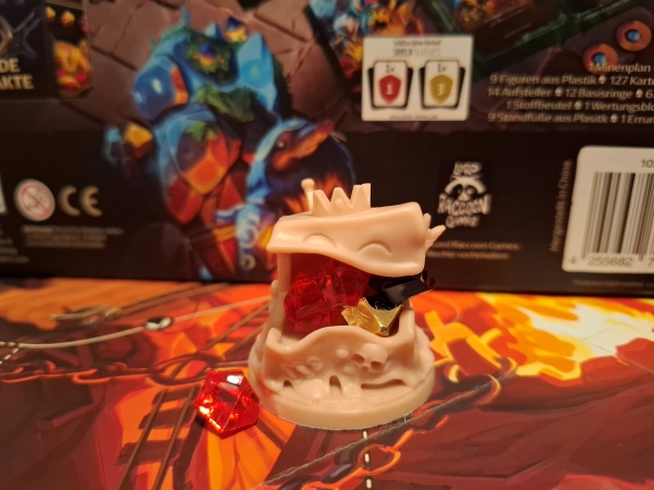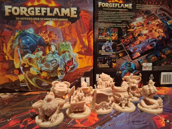 Thematisch weiß „Forgeflame“ definitiv zu überzeugen: Gold, Mithril, Dunkeleisen und Drakonit (aus Plastik) wollen aus der Mine geborgen und in der legendären Schmiede zu mächtigen Artefakten verarbeitet werden. Besonders hervorzuheben ist dabei ein Detail, das man bei Brettspielen bislang nur selten gesehen hat: Die Charakter-Miniaturen tragen die gesammelten Erze tatsächlich sichtbar mit sich herum. Damit überträgt sich das Thema des Spiel unmittelbar auf die Spielenden und es macht Spaß, die kleinen Steine zu platzieren und dann wieder auf dem Spielplan abzuladen, um die Artefakte zu schmieden. Welch ein wirkungsvolles Element, von dem sich andere Spiele gerne inspirieren lassen können.
