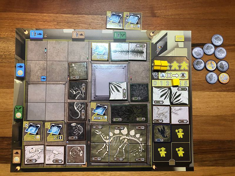 Die gezogenen Fossilienteile landen zunächst in eurem Lager. Von dort könnt ihr sie später in eurem Museum ausstellen. Fossilien bestehen aus unterschiedlich vielen Teilen, was das Sammeln zu einer kleinen Herausforderung macht: Ein vollständiger T-Rex benötigt beispielsweise deutlich mehr Planung als ein einzelnes Ammoniten-Plättchen. Beim Ausstellen kommt zusätzlich ein räumliches Puzzle ins Spiel, denn eure Museumstableaus bieten Podeste, Sonderfelder und thematische Zonen, die bestimmte Fossilienarten belohnen. Wer geschickt platziert, erhält mehr Einkommen, mehr Gäste oder zusätzliches Prestige.
