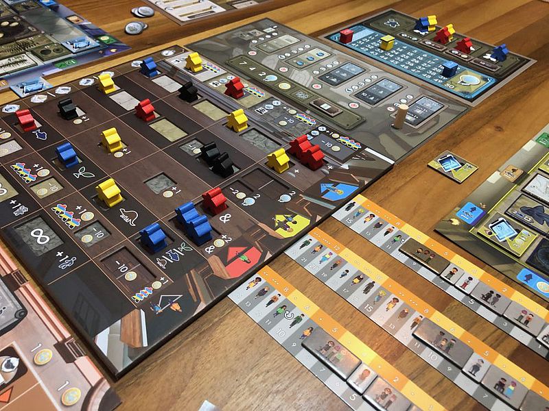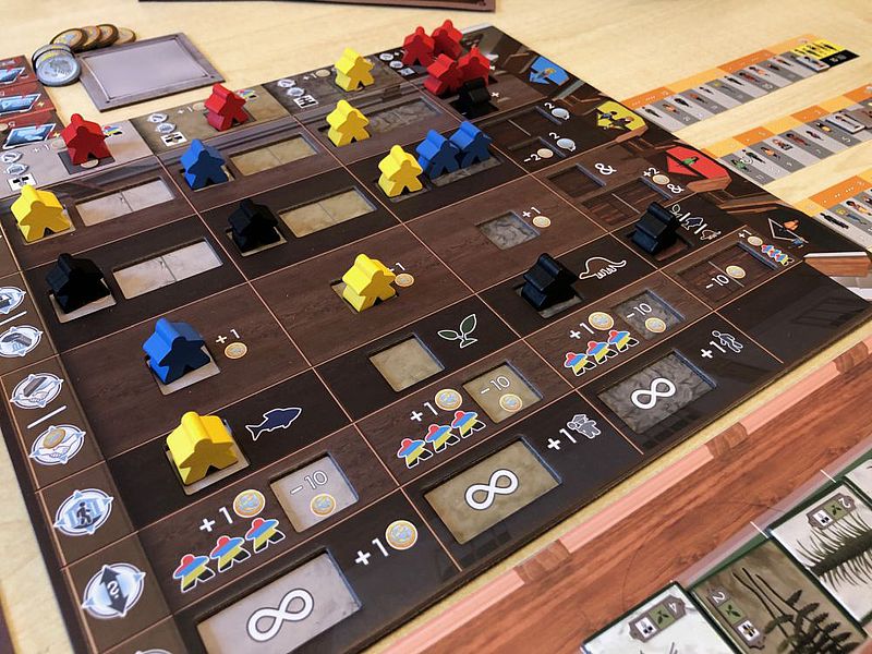 Etwas Kopfzerbrechen bereiten mir die Besucher*innenleisten. Diese sind aus meiner Sicht nicht optimal gelöst. Möglicherweise hätten kleine Führungsschienen unter dem Spielplan geholfen, damit die Leisten nicht verrutschen. Sollte es eine zweite Auflage geben, wäre hier eine Überarbeitung wünschenswert. Ähnliches gilt für den Markt: Es fehlt eine eigene Geldleiste, sodass sich zwei Reihen eine Leiste teilen müssen, was das Ganze etwas unübersichtlich macht.