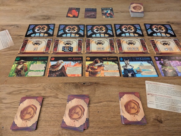 Thematisch darf man natürlich nicht zu viel erwarten, denn es bleibt am Ende doch ein abstraktes Kartenspiel mit Karten, die aus irgendwelchen Gründen mal eine „1“ tragen, mal eine „4“ oder eben die begehrte „6“. Ein wenig Thema bringen lediglich die Charakterkarten und die Vertreter der fünf Reiche, von denen wir pro Spiel jeweils nur einen Einzigen für uns gewinnen können und die uns mächtige Sonderfertigkeiten bringen. Das reicht nicht für wirkliche Immersion, bringt aber ein schönes Gesamtbild auf den Tisch.