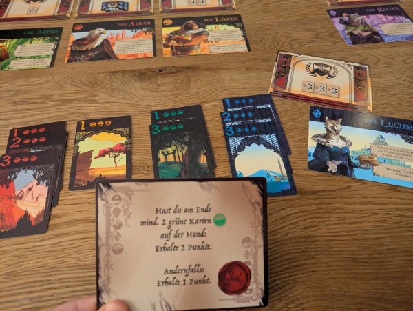 Die kleine Box ist auch wegen ihres Inlays prall gefüllt, aber im Wesentlichen sind dort jede Menge normal- und einige großformatige Karten enthalten. Die Qualität der Karten könnte etwas besser sein, ist für mich aber gerade so noch in Ordnung. Die Gestaltung hingegen ist schon wirklich ansprechend, denn die asiatisch anmutende Designsprache in Verbindung mit den Tiercharakteren, wie sie auch auf der Schachtel zu sehen sind, macht schon was her. Auch die Spielkarten, die lediglich die Landschaften der fünf Reiche symbolisieren, sind schön anzusehen. Hier gefällt mir das Spiel in all seiner Abstraktheit richtig gut.