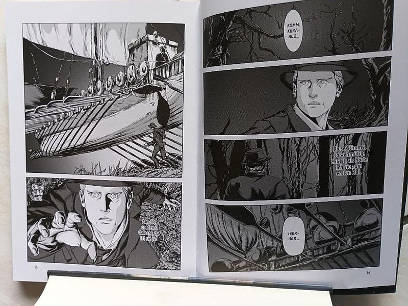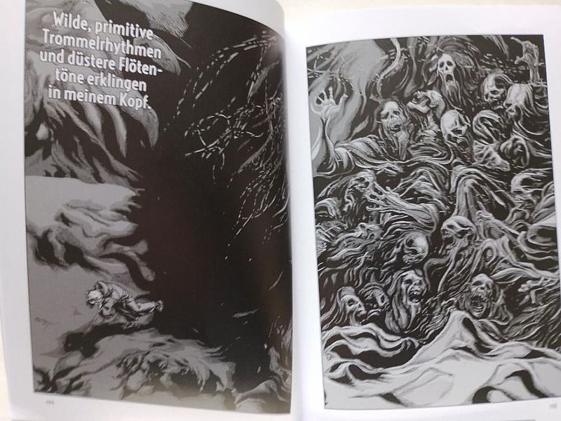 Wie im Teaser eingangs bereits geschrieben, ist der Band künstlerisch interessant und handwerklich solide. Die Zeichnungen sind detailliert, realistisch und dynamisch durch wechselnde Größen der Panels, die sich manchmal sogar über zwei Seiten erstrecken. Ich finde den Schwarz-Weiß-Zeichenstil immer noch ansprechend; so bleibt das Ausmalen der phantastischen Szenen im Horror-Stil gewissermaßen der Fantasie der Leser*innen vorbehalten. Die atmosphärische Grundstimmung ist von Spannung und auch etwas Grusel geprägt.