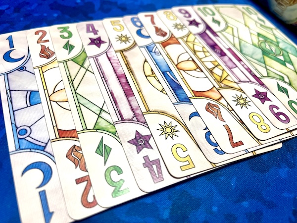 „Lumen“ bietet vor allen Dingen erst einmal Dinge, die wir von einfachen Stichspielen kennen. Es gibt eine dauerhafte Trumpffarbe, es besteht Bekennzwang und es wird solange die Hand abgespielt, bis die 10 Karten als Stiche unter euch verteilt sind. Die Kartenwerte gehen dabei von 1 bis 12 und sind auf fünf verschiedene Farben verteilt. Und wenn ich euch jetzt noch sage, dass ihr vor dem Ausspielen der ersten Karte noch festlegen müsst, wie viele Stiche ihr in dieser Runde machen werdet, fühlen sich sicher einige von euch an Klassiker wie „Wizard“ oder „Skull King“ erinnert. Warum braucht es also noch eins dieser Spiele? Da muss doch etwas Besonderes sein?