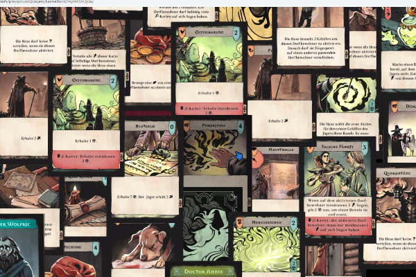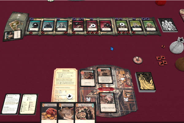 Die (virtuellen) Komponenten vermitteln ebenfalls, dass wir es hier mit einem ausgereiften Produkt zu tun haben. Der Tischaufbau ist aufgeräumt und strukturiert, was bei diesem Spiel auch notwendig ist. Es gibt mehrere Tableaus, die Ordnung schaffen und helfen, die diversen Karten zu organisieren. Denn abgesehen von ein paar verschiedenen Markern, dreht sich hier alles um die Karten. Das Layout ist nicht nur funktional, sondern sind auch wunderbar illustriert und vermittelt eine dem Thema entsprechend schön düstere Stimmung.