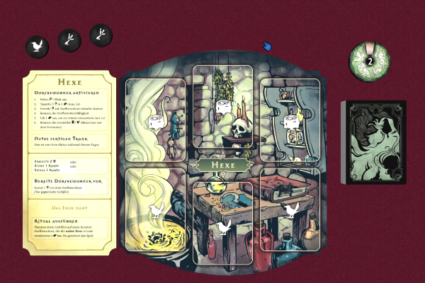 Jede Aktion ist wunderbar thematisch eingebettet. Seien es die Tränke oder der Gefährte der Hexe oder aber die Verbündeten des Jägers sowie die Untersuchungen, die er anstellen kann. Auf beiden Seiten herrscht ständig ein großer Druck, irgendwie voranzukommen, ohne dem anderen zu viel Spielraum zu lassen. Man fühlt sich tatsächlich als Jäger und auch als Hexe in einem mittelalterlichen Katz-und-Maus-Spiel. Jede Aktion geht nur darum, die Pläne des Gegners zu durchkreuzen oder die eigenen voran zu treiben. Wenn man also mit jemandem spielt, der es schon nicht vertragen kann, dass man ihm einen Arbeiterplatz wegschnappt und er deswegen weniger Schafe hüten kann, dann sollte man von diesem Spiel wohl lieber die Finger lassen.