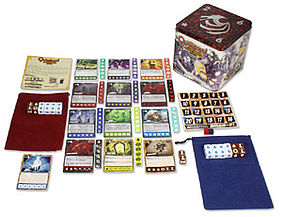 Dreizehn Karten werden auf den Tisch gelegt. Während die drei Grundressourcen feststehen, werden drei Zaubersprüche und fünf Kreaturen vor jeder Partie zufällig gezogen. Somit liegt in jedem Spiel eine andere Kombination von Karten aus. Auf jede Karte werden fünf Würfel der entsprechenden Farbe gelegt. Anschließend legt jeder Spieler vier Unterstützerwürfel und acht Kraftwürfel in seinen Beutel und schüttelt ihn ordentlich. Los geht’s.