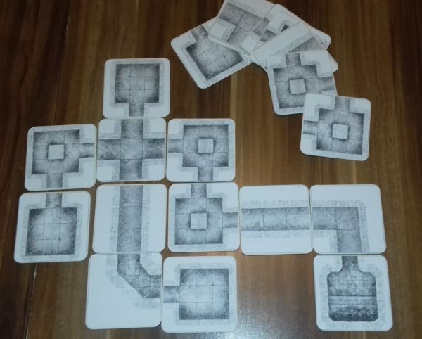 Dann wollte ich gerne ein wenig Haptik ins Spiel bringen. Dieser Teil der Vorbereitung war zugegebenermaßen sehr zeitaufwändig – einmal erledigt, kann man allerdings vielfach davon zehren. Auf der einen Seite bastelte ich aus Bierdeckeln und selbstgedruckten „Dungeon Tiles“ (ich verlinke weiter unten einige gratis verfügbare Modelle) einen modularen Dungeon zum Selbstauslegen. Um meinen Spielern darüber hinaus noch etwas mehr direkt „an die Hand“ geben zu können, bastelte ich noch einige Karten mit Fallen, magischen Gegenständen und klassischen Monstern. Diese sollten einerseits als Inspiration dienen, konnten andererseits aber auch im Spiel als Visualisierungshilfe herhalten und darüber hinaus auch Spielwerte beinhalten. Zu guter Letzt bereitete ich auch noch einige Zahlenrätsel vor.