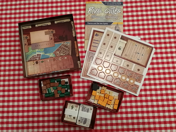 Eine kleine Anekdote am Rande: Das erste größere Brettspiel, welches der Rezensent vor vielen Jahren beim Ringboten rezensierte, war „Firenze“. Dessen Autor war Andreas Steding. Genau dieser zeichnet sich auch für das hier vorliegende Spiel „Rival Cities“ verantwortlich. Warum es allerdings unbedingt ein englischer Titel sein muss, kann man nur raten, zudem die Anleitung als auch der Inhalt nicht mehrsprachig sind. Selbst bei einer internationalen Vermarktung müsste dies also alles ausgetauscht werden. Aber vielleicht klingt ein englischer Begriff im kleinen Spielwaren-Marketing einfach besser ...