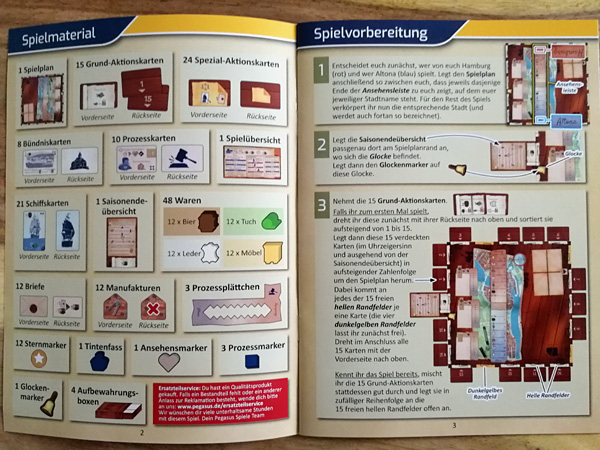Ein zweites Lob geht an dieser Stelle an die Ersteller der Spielanleitung, vor allem für die Übersicht des Spielinhaltes als auch die Karte für den Aufbau. Beides ist vorbildlich strukturiert und für jede Aktion mit Bildern oder Hinweisen versehen. Man bekommt eine Seite mit dem Spielmaterial, wo die genaue Anzahl als auch ein Bild des Materials zu finden ist. Für die Spielvorbereitung wird in einzelnen Schritten dann ebenso mit Bildern gezeigt, wo welches Material genau wo zu setzen ist. So gelingt der Spielaufbau selbst beim ersten Mal in kurzer Zeit.