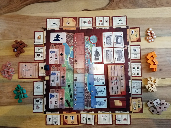 Im ersten Spiel des Rezensenten hatte dieser verschiedene Bereiche gut abgedeckt und im Gegensatz zur Gegnerin eine wesentlich bessere Warensituation. Nur die Schiffe hatte er vernachlässigt. Als die Gegnerin ein zweites Schiff erwarb, gab es keine schnelle Möglichkeit, selbst eines zu erwerben. So war das Spiel dann schnell vorbei, da die Gegnerin mit einer Spezialkarte günstig an das dritte Schiff kam und damit den Sofortsieg sicherte, obwohl sie ansonsten eher zurücklag.