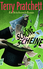 Der Manhattan Verlag, der die Bücher in Deutschland herausgibt, hat seit einigen Jahren die schöne Angewohnheit übernommen, Pratchetts Romane zunächst als Hardcover in besserer Aufmachung herauszubringen, was sonst ja nicht vielen ausländischen Autoren – schon gar nicht im Fantasy-Sektor – zuteil wird. Die Qualität des Buches ist wie immer gut, man hat etwas Ordentliches in der Hand. Interessanterweise hat man das Originalcover aber wieder mal nicht übernommen, sondern ein eigenes neues anfertigen lassen. Dies hängt sicherlich auch mit dem deutschen Titel „Schöne Scheine“ zusammen, zu dem das Originalcover weniger passte. Womit wir auch beim Titel und dem nächsten Geheimnis des Verlages wären. Warum der Originaltitel „Making Money“ nicht – und wenn nur in ähnlicher Art – übersetzbar war, erschließt sich mir nicht. Man kann auf jeden Fall nur hoffen, dass Manhattan mit „Schöne Scheine“ nicht in die Tradition früherer Jahre zurückfällt, als es von Pratchett in Deutschland „Heiße Hüpfer“ und „Fliegende Fetzen“ gab und man sich unter Umständen mehr an Prosa aus einem ganz anderen Bereich erinnert fühlte...