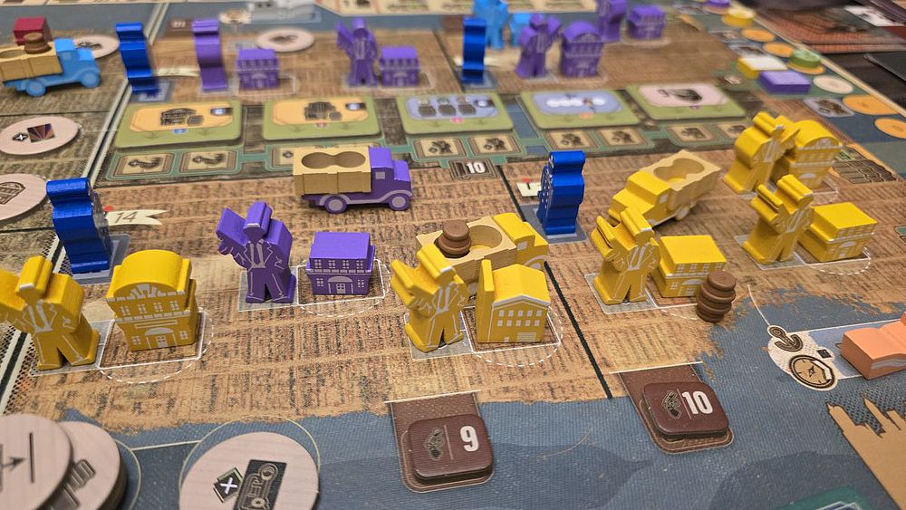 Hervorragend finde ich, dass der zweite Teil der Restaurant-Aktion durchaus sehr attraktiv ist. Oft geht man nur für den zweiten Teil der Aktion ins Restaurant. Ich darf dort nämlich neben einer Aktionskarte endlich auch Stadtplättchen ausspielen, die ich vorher etwa durch den Bau von Gebäuden gesammelt habe. Und ich darf (ebenfalls vorher gesammelte) Bücher ausgeben. „Cooking Books“ heißt das im Englischen. Damit ist das buchhalterische Frisieren von Geschäftszahlen gemeint. Damit kann ich vorgegebene Ziele auf einer First-Come-First-Serve-Basis erfüllen. Und das gibt einen Haufen Geld für meinen Safe a.k.a. Siegpunkte.