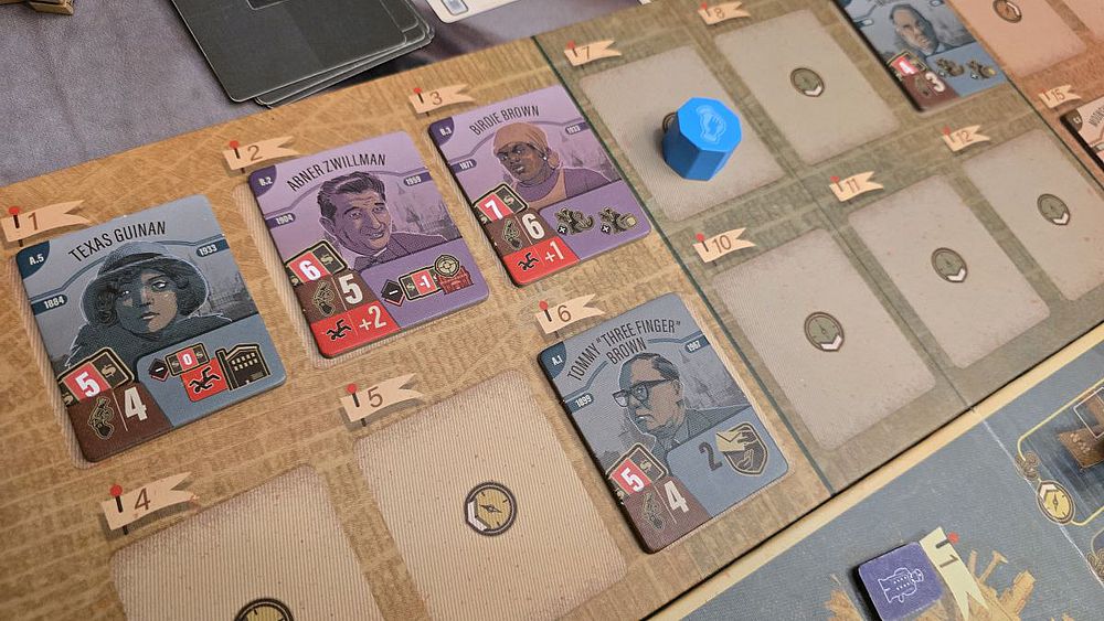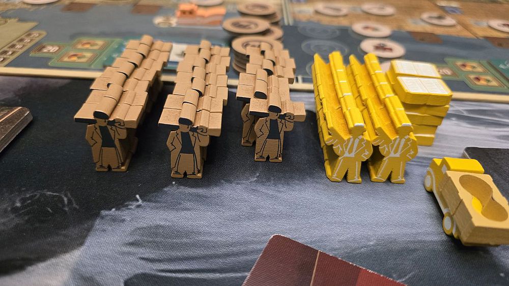 Das Herz unseres Tuns stellen die Arbeitereinsetzfelder dar. Unsere Arbeiter sind in „Speakeasy“ nichts geringeres als Capos. Das sind die Familienoberhäupter unserer Mafiafamilie. Wir besuchen einen von acht unterschiedlichen Orten. An diesen Orten finden wir jeweils zwei bis drei unterschiedliche Gestalten. Und mit jeweils einer dieser Gestalten reden wir. Daraus ergeben sich Handlungsabläufe. Es gibt immer eine Handlung, die ortsbezogen ist und eine Handlung, die (oftmals) personenbezogen ist. So muss man je nach Einsetzfeld erst das eine und dann das andere tun. Angenehm ist, dass die Blockade einer Person durchaus umgangen werden kann. Dreimal pro Spielrunde hat die Spielgruppe die Möglichkeit, einen Capo einer fremden Familie von einem Feld herunterzugeleiten. Das wird ihm mit einem kleinen Bonus schmackhaft gemacht.