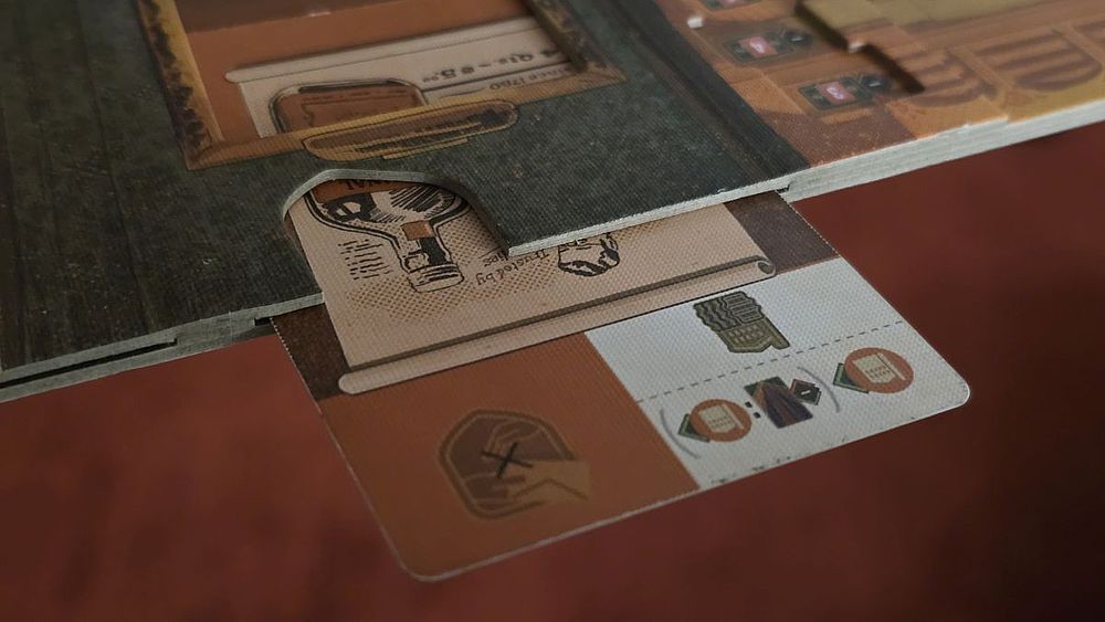 Alle flachen Holzteile sind bedruckt und schön gestaltet. Auch die Fässer machen einen guten Eindruck. Die Spielkarten haben eine sehr gute Qualität, wie auch die Papptoken. Die Autoritätsmarker sind ungewöhnlich groß und erinnern ein wenig an Polizeimarken. In der mir vorliegenden Version war das Einslotten der Spielkarten in das Spielerboard etwas fummelig und hätte konstruktiv besser gelöst werden können. Das Ergebnis war jedoch sehr sehenswert: Die Kartenmotive fügen sich nahtlos in das auf dem Spielerboard abgebildete Zimmer ein. Bilderrahmen werden gefüllt, der Blick aus dem Fenster ändert sich, der Nachbarraum füllt sich, wie die offene Tür verrät. Das sieht schon geil aus! Leider waren die mir vorliegenden Versionen der aufwändig gestalteten Spielerboards etwas gebogen – eine weit verbreitete Multilayer-Pappboard-Krankheit.