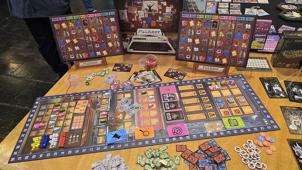 Das bei Tranjis Games erschienene „Pulitzer“ versetzt die Spieler in die turbulenten frühen 1970er Jahre in den USA, wo sie als Chefredakteure einer investigativen Redaktion um den begehrten Pulitzer-Preis kämpfen. In dem Worker-Placement-Spiel mit verdeckter Platzierung, bei dem Journalisten strategisch auf dem Spielplan eingesetzt werden, sammeln die Spieler Hinweise und Informanten. Die Spieler müssen durch geschickte Recherche und das Sammeln von Beweisen einen möglichst brisanten Report zusammenstellen, um bei der Endwertung die meisten Punkte zu erzielen und sich so den historischen Preis zu sichern. Das Ermittlungsboard eines Spielers sieht aus wie eine Tafel für die Lösung eines Kriminalfalls, bei der die einzelnen Hinweise mit Schnüren verbunden werden. Spielmechanisch spielt die Länge der Schnur eine Rolle. Und echte Stecknadeln gibt es auch.