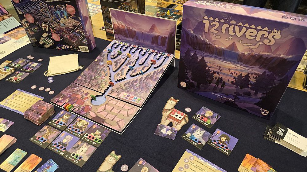 Ein Hingucker ist auch „12 rivers“ von BGNation beziehungsweise Good Games Publishing. Die Spieler führen einen Stamm an, der die mystischen zwölf Flüsse erkundet, die von einem Bergsee herabfließen. Für die Dorfbewohner sammelt man wertvolle, magische Perlen, die im Wasser treiben. „12 rivers“ ist ein Worker-Placement-Spiel mit Elementen des Set Collection, das auf einem dreidimensionalen Spielbrett mit einer schiefen Ebene gespielt wird, auf der farbige Perlen tatsächlich physikalisch hinunterrollen. Die Ausstattung wie die Murmelgröße hat man im Vergleich zur Vorgängerversion verbessert. Die Spieler setzen strategisch Alpaka-Arbeiter entlang der Flüsse ein, um die rollenden Perlen zu sammeln und diese an Dorfbewohner-Karten zu liefern, wodurch sie Synergien und die meisten Siegpunkte erzielen.