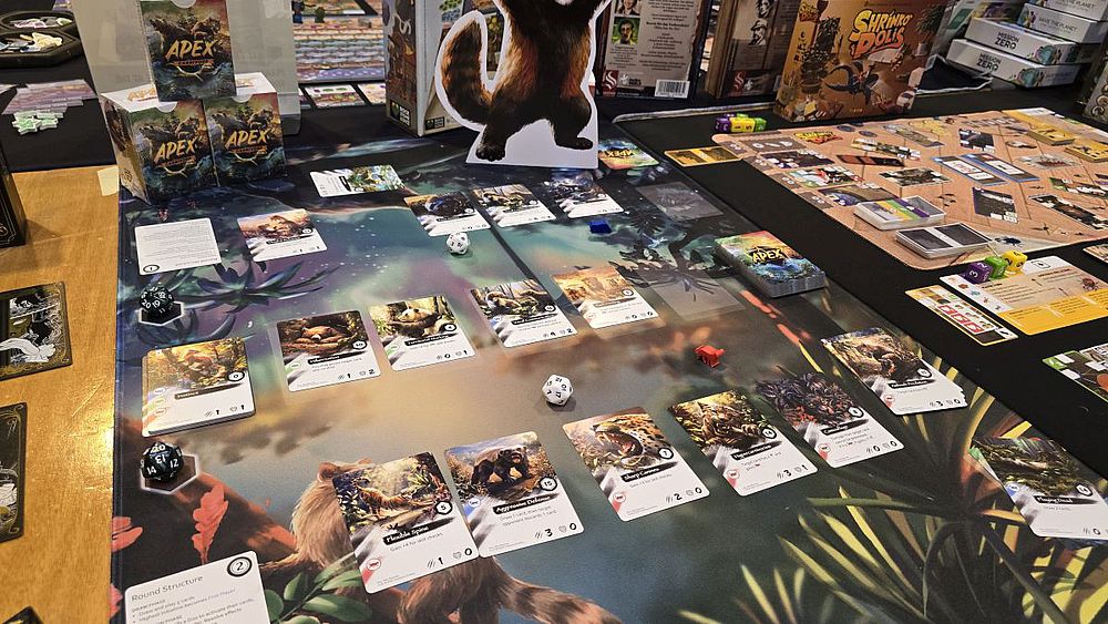Bei „APEX – Carnivore“ (OneStone Studios), einem schnellen, direkten Evolutions-Deckbuilding-Spiel schlüpfen die Spieler in die Rolle von prähistorischen Raubtieren, die um Territorium und Ressourcen konkurrieren. Die Spieler beginnen mit einem Startdeck und entwickeln ihre Spezies weiter, indem sie neue, stärkere Karten (Futter, Raubtiere) kaufen und ihr Deck verbessern, um so zum Spitzenprädator zu werden. Das Hauptziel ist es, die Lebenspunkte des Gegners auf null zu reduzieren, wobei Würfel eine zufällige Komponente und zusätzliche Spannung in die Aktivierung von Karteneffekten und den Kampf bringen, wenn man denn Würfel und den damit verbundenen Glücksfaktor mag.