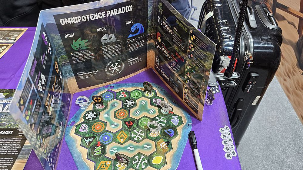 „Paradox Island“ ist ein Deduktions-Abenteuerspiel, bei dem alle Spieler außer einem die Insel blind erkunden müssen, um die Karte zu rekonstruieren und ihre Missionen zu erfüllen. Ein Spieler übernimmt die Rolle des „Omnipotence Paradox“ (OP), der als Einziger die Karte sieht und versucht, die anderen Spieler fünfmal scheitern zu lassen, während die anderen Spieler („Gefangene“) versuchen, ihre Bewegungs- oder Besuchsziele als Erster zu erreichen. Die Gefangenen führen in ihrem Zug bis zu zwei Aktionen aus (unsicher bewegen, sicher bewegen oder Energie wiederherstellen), wobei der OP nach jeder Bewegung das Zielfeld benennt, während dieser zudem drei Kreaturen (Fels, Busch und Welle) auf der Insel bewegt, um die Pläne der Gefangenen zu stören. Schön gestaltet zwar, erschien uns das Spiel aber eher was für Deduktionsprofis zu sein.