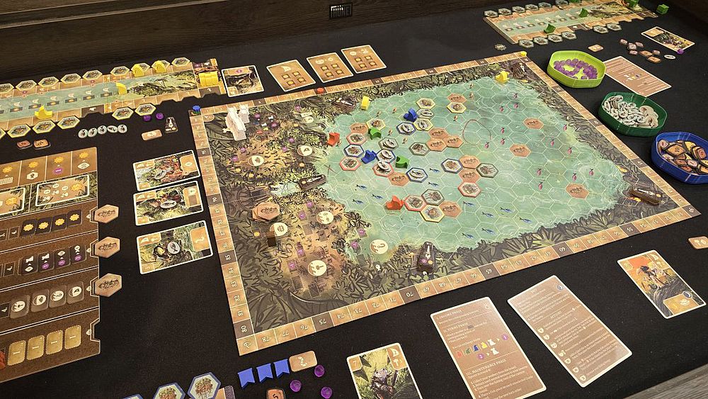 „Feya’s Swamp“ ist ein Strategiespiel von Helge Ostertag („Terra Mystica“) und Anselm Ostertag, in dem die Spieler als Klans von Sumpfbewohnern versuchen, durch die geschickte Nutzung ihrer Umgebung und das Wecken mächtiger Gottheiten zum wohlhabendsten Klan der Gegend aufzusteigen. Das Spiel läuft über vier Runden ab, wobei die Hauptaktionen in der Zugphase durch das geschickte Bewegen der Boote und das Platzieren von Arbeitern (Worker Placement) erfolgen, um zu fischen, Handel zu treiben, Tempel zu erkunden und Siedlungen zu bauen. Das Hauptziel ist es, die meisten Siegpunkte zu sammeln, indem man am meisten zur Entwicklung des Sumpfes beiträgt und variable Spielziele erfüllt. Schön ist, dass sich der Sumpf langsam in ein Venedig mit lauter Kanälen entwickelt, die die Spieler selbst erschaffen. Hinsichtlich der Interaktion auf der Karte ist es damit noch einmal eine Stufe über „Terra Mystica“ angesiedelt. Die Aktionen selbst sind schnell zu begreifen. Die Vorfreude auf den Release in Deutschland durch Strohmann Games wohl im ersten Quartal 2026 ist bei mir riesengroß. Ich werde mich dem Spiel definitiv nochmal genau widmen und das in einer Rezension auf Ringbote Online verarbeiten.