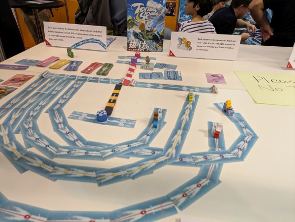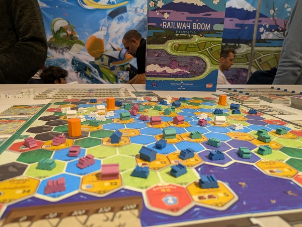 Der Verlag Arclight Games konnte seinerseits mit mehreren Neuheiten glänzen. Zum einen hatten sie eine Reimplementierung von Hisashi Hayashis „Railway Boom“ im Gepäck, das in der Kombination mit den Illustrationen von Ian O’Tool schon allein für jede Menge Aufmerksamkeit gesorgt hätte. Aber „Tornado Splash“ mit seinem sehr eleganten Mechanismus für echtes Rennspiel-Feeling und das schöne „Snow Colony“ machten den Hype perfekt. Dort war jeden Morgen direkt zu Beginn eine lange Schlange zu finden und alle Spiele waren dann auch schnell ausverkauft.