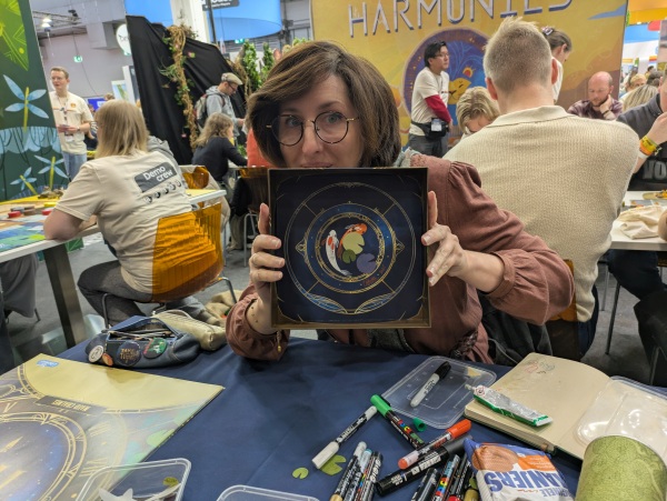 Ein weiteres tolles Spiel, das wir vor Messe schon erworben haben und es deswegen nicht zu den Entdeckungen der Messe zählen, ist „Take Time“. Das kooperative Deduktionsspiel überzeugt nicht nur im Gameplay, sondern sieht dabei auch wunderschön aus. Das haben wir der Illustratorin Maud Chalmel zu verdanken, die sich in mehreren Sessions sehr viel Zeit zum Signieren nahm. Dabei wurde nicht nur einfach unterschrieben, sondern ein kleines Meisterwerk in den Spieldeckel gezaubert.