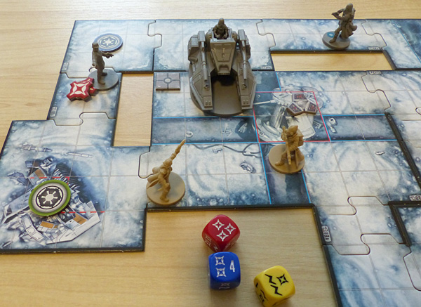 Am Spielprinzip selbst ändert sich gar nichts, weswegen hier einfach auf die Rezension zum Grundspiel verwiesen werden soll. Die Kampagne „Rückkehr nach Hoth“ besteht aus einer Einführung, drei Haupteinsätzen, einem Zwischenspiel, fünf Nebeneinsätzen und dem großen Finale. Die Haupteinsätze werden je nach Abschneiden im vorigen Einsatz gewählt (Sieg oder Niederlage), Einführung, Zwischenspiel und Finale sind festgelegt. Die Nebeneinsätze werden aus einem Pool gezogen. Man kennt das aus dem Grundspiel. Neu sind die Bedrohungseinsätze, die ähnlich wie Nebeneinsätze funktionieren, aber den Nachteil haben, dass sie dem imperialen Spieler Verderbens-Belohnungskarten bescheren, solange sie unbewältigt offen ausliegen. Haben die Rebellen eine Bedrohung abgewendet, erhalten sie eine Triumph-Belohnungskarte. Neben den unmittelbaren Effekten verweisen auch manche Haupteinsätze auf diese speziellen Karten. Es ist also durchaus wichtig, diese Bedrohungen vom Tisch zu schaffen.