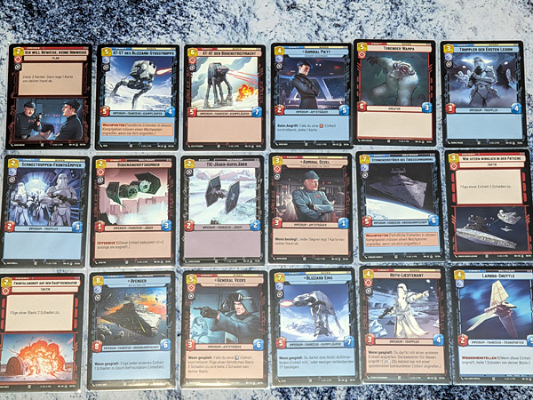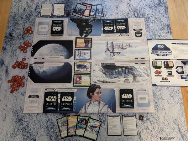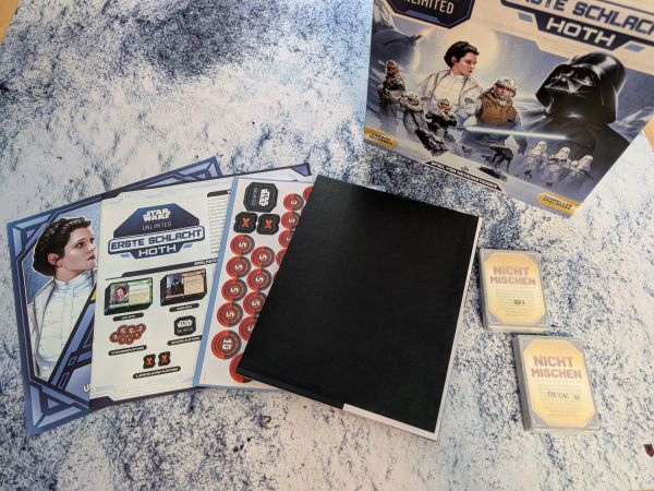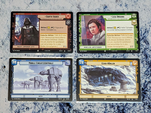 Fazit: Sieht man davon ab, dass das Vader-Deck deutlich leichter zu spielen ist als das Leia-Deck, weil es einfach die stärkeren Einheiten hat, liegt mit „Star Wars Unlimited: Erste Schlacht – Hoth“ ein wirklich tolles Einsteiger-Set vor, das alles enthält, was man für erste Partien braucht und beispielsweise den alten „Star Wars: Unlimited – Der Funke einer Rebellion (Zwei-Spieler-Starter)“ in Sachen Qualität auch nochmal übertrumpft (robuster Pappspielplan, feste Papp-Spielmarker). Sammler erfreuen sich zudem an den zahlreichen exklusiven Karten, die überdies fast durch die Bank sehr schön aussehen. Bei dem sehr guten Preis von knapp 20 Euro, gibt es dafür von mir eine glatte Kaufempfehlung, auch wenn man kein Interesse an Sammelkarten hat und bloß ein kurzweiliges „Star Wars“-Kartenspiel sucht. Es würde mich freuen, wenn gelegentlich weitere thematische Sets – etwa zur Schlacht um Endor oder zum Kampf um Naboo – erscheinen würden.
