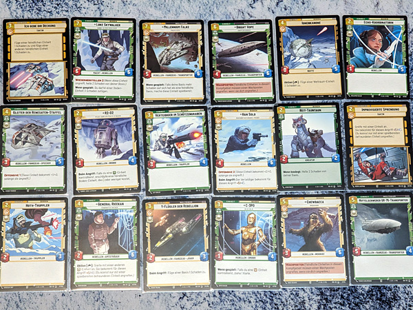 Anders herum gesprochen bedeutet das, dass das Rebellendeck alles andere als „leicht“ zu spielen ist. Denn wenn man gegen Vader und seine Truppen siegen will, muss man sehr genau überlegen, welche Strategie man wählt. So empfiehlt es sich in meinen Augen beispielsweise, die Imperialen so konsequent wie möglich zu dezimieren, auch wenn man dadurch erstmal weniger Schaden an der feindlichen Basis anrichtet. Denn lässt man die Imps gewähren, wird ihr Schadenspotenzial rasch krass hoch, vor allem, wenn Vader selbst ins Spiel eingreift. Auch sollte man sich nicht verlocken lassen, Karten, die eine feindliche Einheit erschöpfen können, zu früh zu verheizen. Es ist viel wichtiger, kurz vor Ende einen AT-AT zu blockieren als zu Beginn einen Schneetruppler, überspitzt ausgedrückt. Insofern sollte sich gerade der Rebellenspieler sehr genau anschauen, welche Karten er zu Beginn sicher auf der Hand hat und die Möglichkeit eines Mulligans, also des optionalen erneuten Ziehens von 6 Karten, wirklich nutzen.