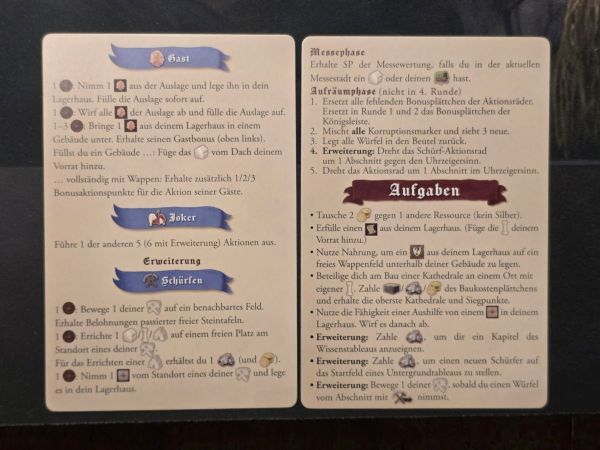 Hervorragend ist, dass es nun endlich Übersichtskarten für jeden Spieler gibt! Dort findet man den (nun nochmal etwas längeren) Rundenablauf mit Erweiterung, genauso wie eine Übersicht der Nebenaktionen oder „Aufgaben“, wie es bei „Tiletum“ heißt. Darüber hinaus werden alle Aktionen auf den Übersichtskarten zusammengefasst. Es ist auch eine Karte für den Solomodus beigefügt. Die müssen sich die Spieler dann allerdings teilen … Ist der angekommen?
