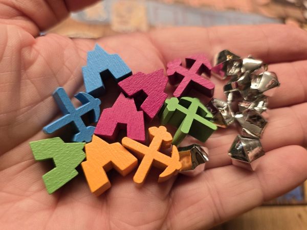 Die namensgebenden Silberstücke sind deutlich schöner als die Rohstoffpappplättchen aus dem Grundspiel. Richtig kleine Silber-Nuggets funkeln uns entgegen. Auch die silberminen-spezifischen Holzfiguren sind sehr ansprechend gestaltet: Hammer-und-Pickel-Figuren machen einen auf Schürfer und auch die sechs Minen pro Spielerfarbe sind gelungen. Farblich passen die Holzteile der Erweiterung wunderbar zu denen des Grundspieles, sodass hier alles schlüssig aussieht, wenn es angerichtet ist.