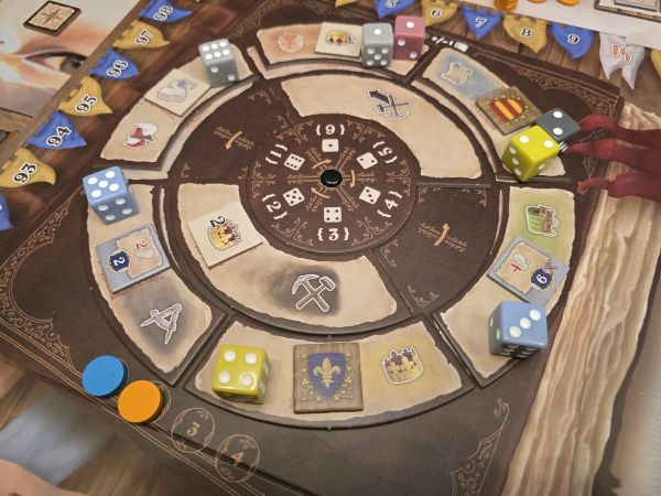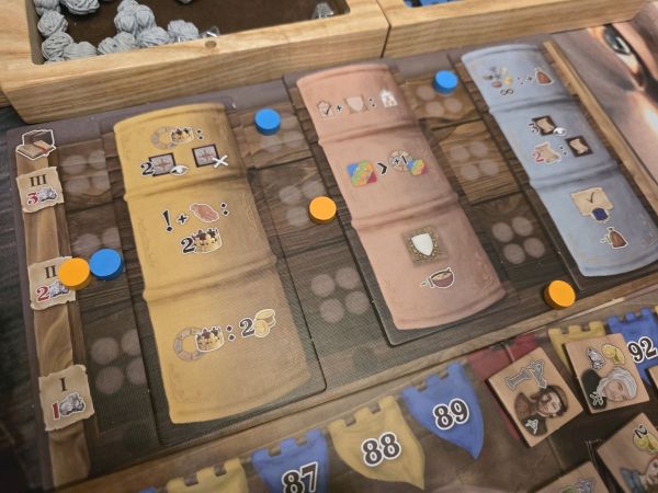 Das Buchtableau bietet Platz für drei Bücher. Gleich neun Bücher sind in der Erweiterung beigelegt. Jedes Buch widmet sich thematisch einer der Hauptaktionen, also etwa „Gast“, „König“ oder „Schürfen“. Hier werden Fähigkeiten oder Rahmenbedingungen rund um die betreffende Aktion durch Voranschreiten auf der Leiste verbessert. Darüber hinaus gibt es noch die Bücher „Ressourcen“ und „Würfel“. Letztere Buchreihe flexibilisiert zum Beispiel die Würfelwerte oder auch die Ressourcen, die man durch die Wahl eines Würfels erhält. Voranschreiten auf den Buchleisten kostet Silber. Der erste Schritt ist mit nur einem Silber noch günstig. EIN SILBER?! Pssst. Ja, genau … Die Kosten steigen für jeden weiteren Schritt. Neben zusätzlicher Ausbildung – und Bildung ist auch in Tielt der Schlüssel zum Erfolg – gibt es für jeder Stufe auf den Buchtracks immerhin noch einen Siegpunkt am Ende des Spiels.