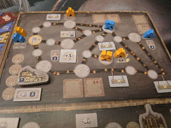 Ganz heruntergebrochen tummeln wir uns mit weiteren Spielfiguren nicht nur auf dem Hauptspielplan, sondern nun auch noch in gleich mehreren Silberminen. Und wir klettern auf Buchleisten nach oben. Ersteres bringt uns Boni, Silbereinkommen über gebaute Minen und neue Bauplätze für Kathedralen. Die Bücher bringen uns themenbezogene Fähigkeiten. Der Bildungszugang funktioniert nur über Silber. Da haben wir aber Glück, dass wir die Silberminen nun mit im Zugriff haben.