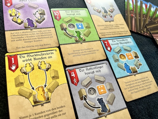Jeder der drei Markttage besteht aus drei Phasen, welche Tageszeiten repräsentieren, in denen ihr beide verdeckt Einflusskarten auswählt. Diese bestimmen, welche Figuren sich bewegen, welche Aktionen ausgelöst werden und wie der Markt sich verändert. Schickst du beispielsweise mit deinen Karten den Gaukler aus, wandern Spielfiguren in dessen Richtung und ziehen zu neuen Ständen. Da braucht es schon die Marktschreierin, um sie zurück zu locken. Der Rattenfänger kümmert sich um die lästigen, überzähligen Nagetiere an den Ständen und die Saboteurin hat nur eins im Sinn: Chaos zu stiften und die gut sortierte Spielsituation durcheinander zu wirbeln.