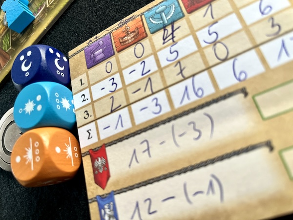 Nach drei Tagen entscheidet der Ruhm – also die Summe der erzielten Punkte – über den Sieg. Zwischenwertungen werden immer auf dem beigefügten Wertungsblock festgehalten und am Ende addiert. Und seid euch gewiss: Je nach Spielsituation kann es zwischendurch auch mal Minuspunkte hageln.